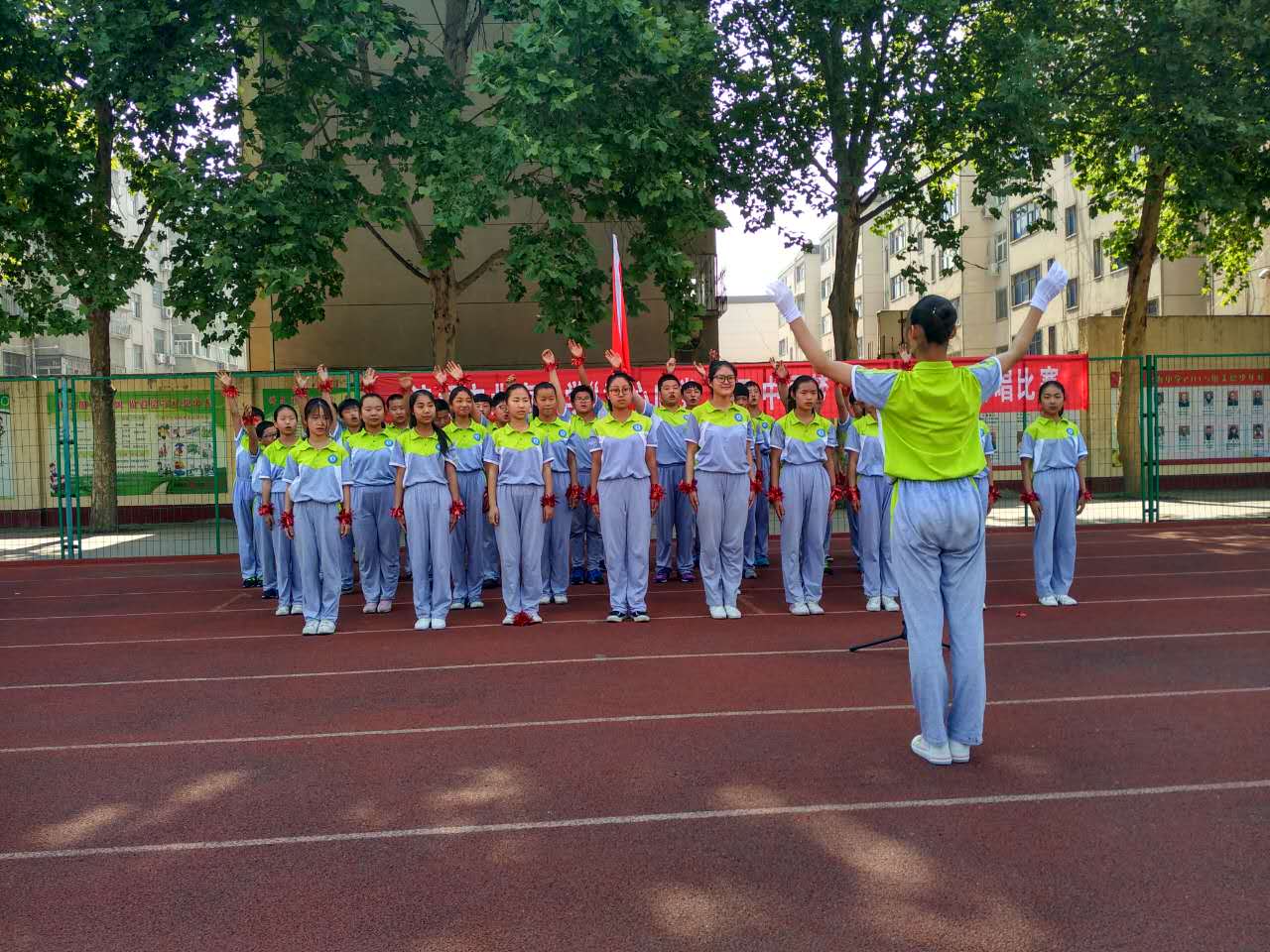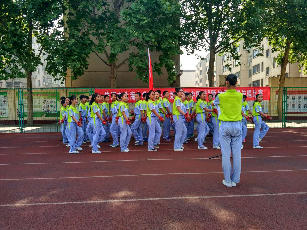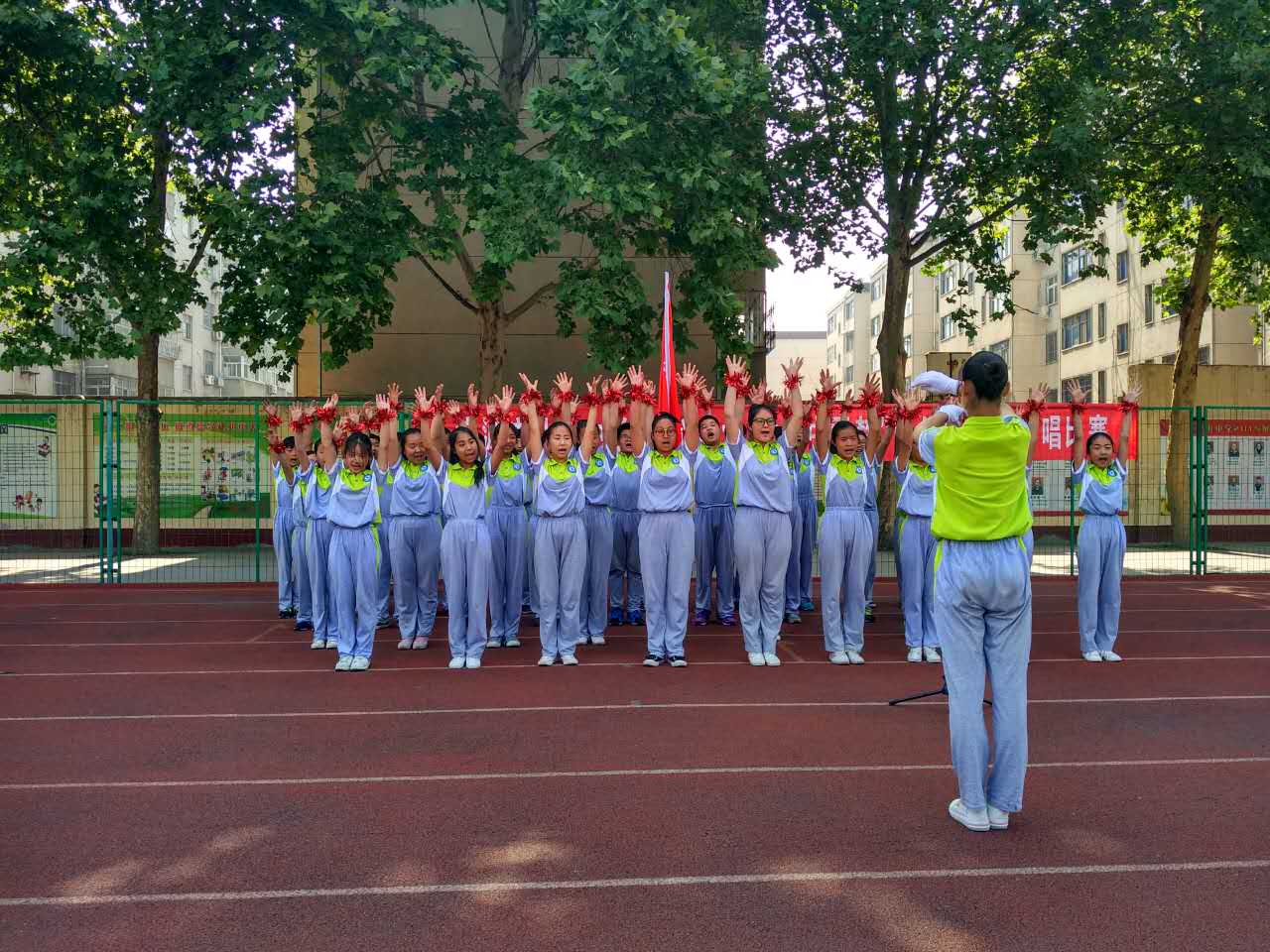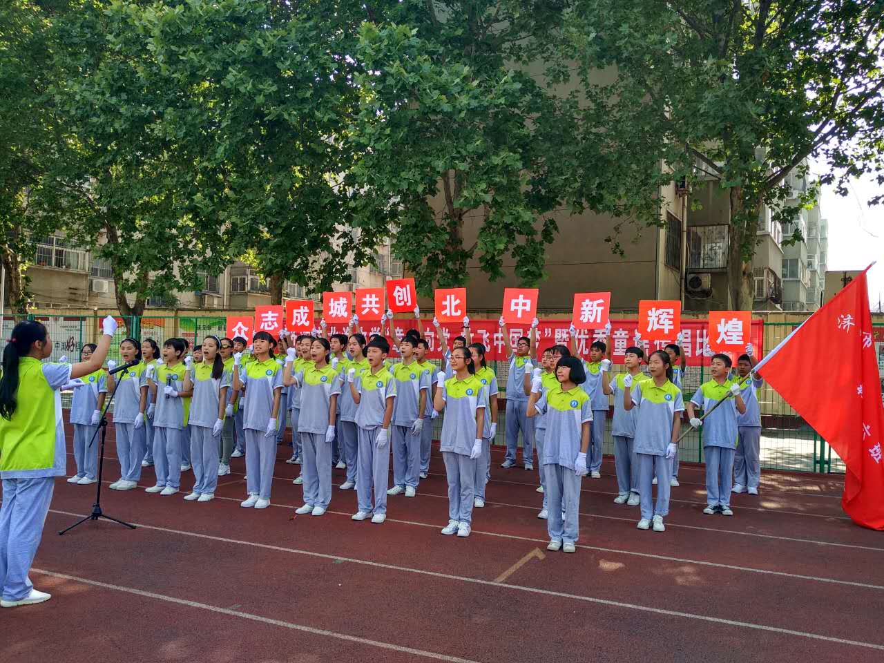 ,党的阳光洒满了整个校园,我们健康、快乐地成长。一面面国旗挥舞着,一张张笑脸绽放在夏日的阳光里,七九班一曲《国家》拉开了“童心向党放飞中国梦”歌咏比赛的序幕。五十六个星座五十六只花五十六族兄弟姐妹是一家七二班深情演绎了《爱我中华》火映红星哟星更亮,血染红旗哟旗更红七一班的《映山红》让我们重温了对红军英雄的无限热爱与不舍之情。七十一班的一曲《十送红军》更是让我们领略了石老师的指挥的魅力,台下师生掌声雷动!七三班的《中国功夫》,铿锵有力,把比赛再一次推向了高潮。七八班的《红歌串烧》,点燃了全场学生的革命激情!七六班带来的《众人划桨开大船》把我们七年师生的心紧紧团结在一起,众志成诚,共创北中辉煌!