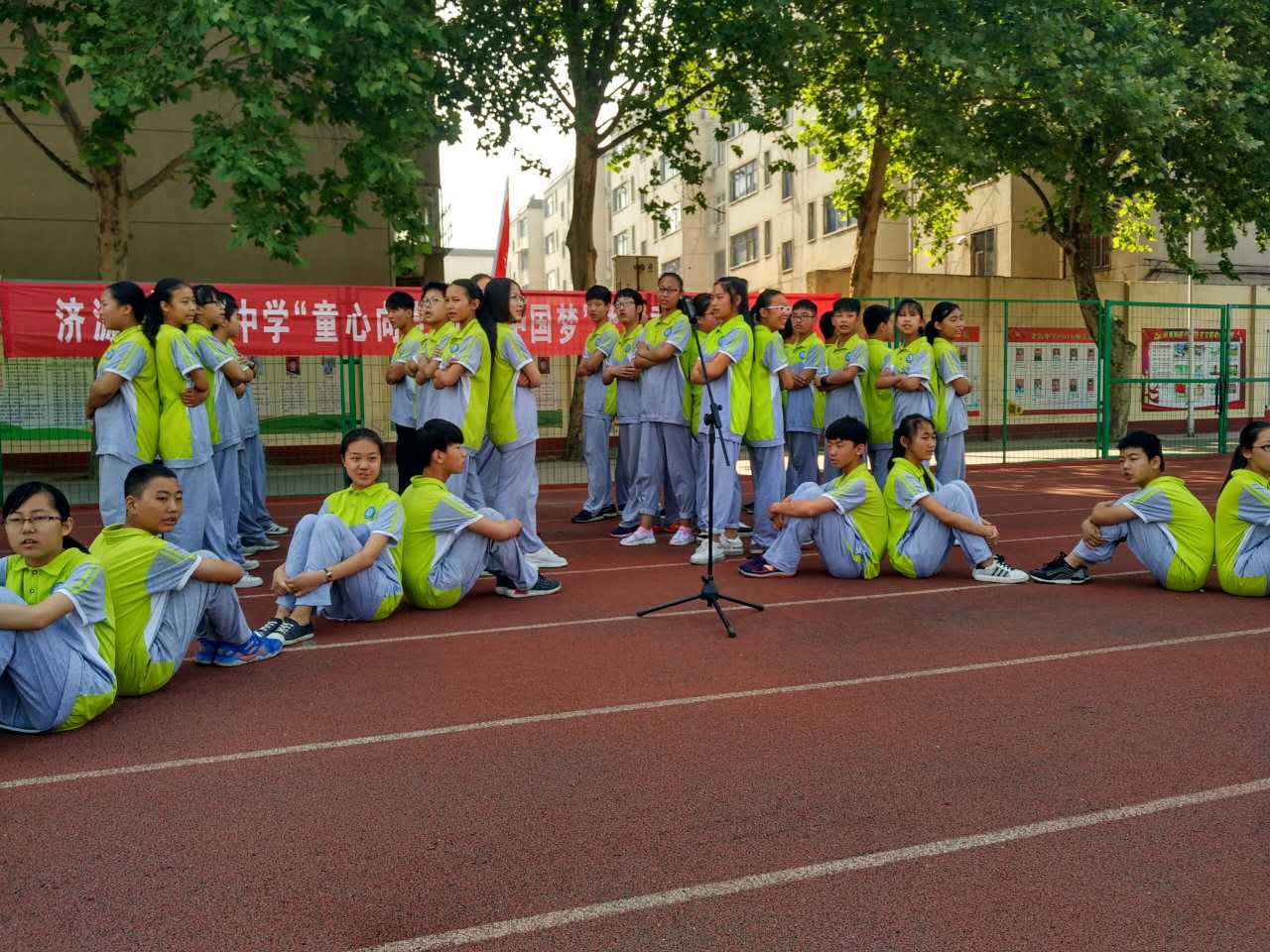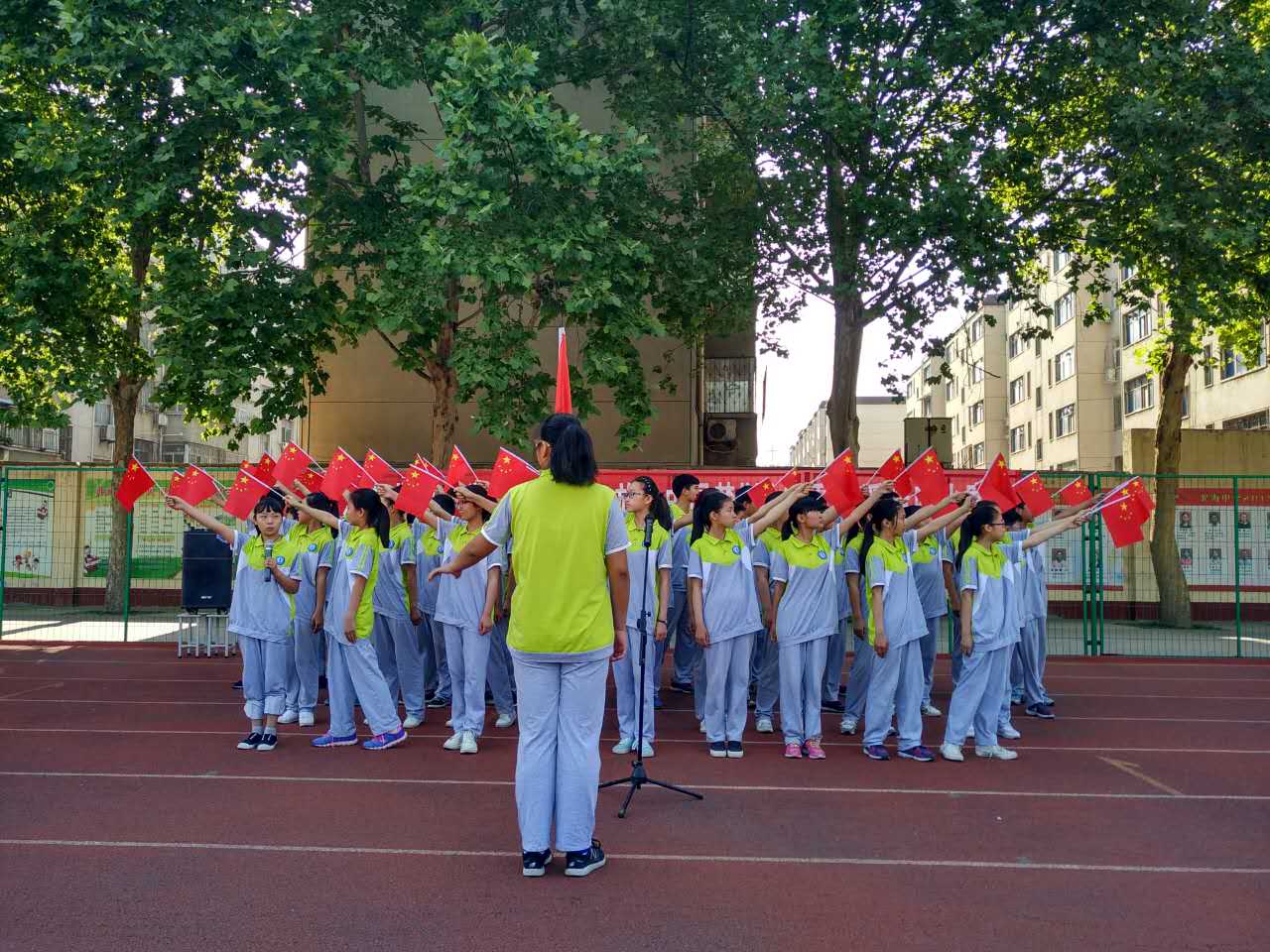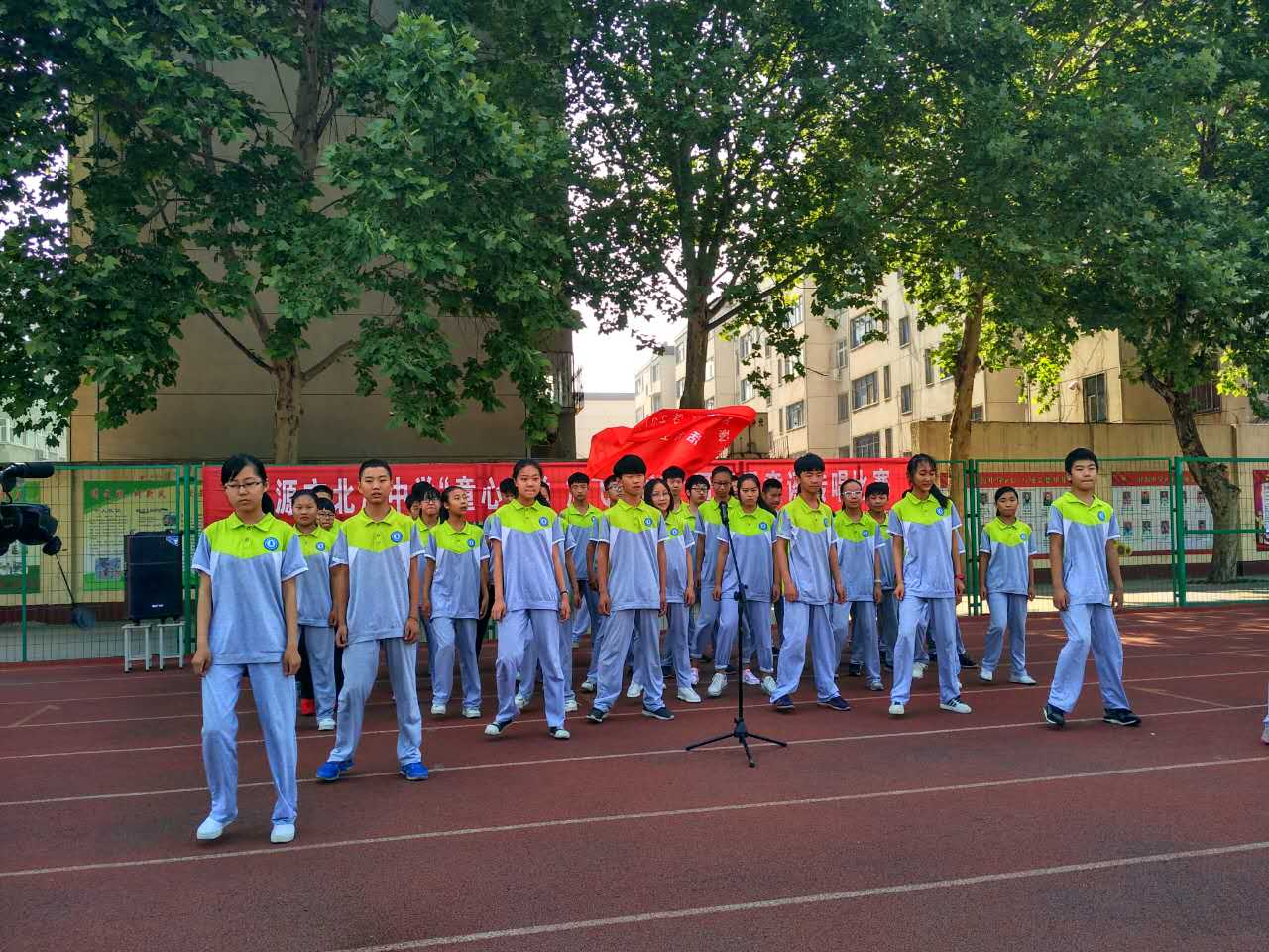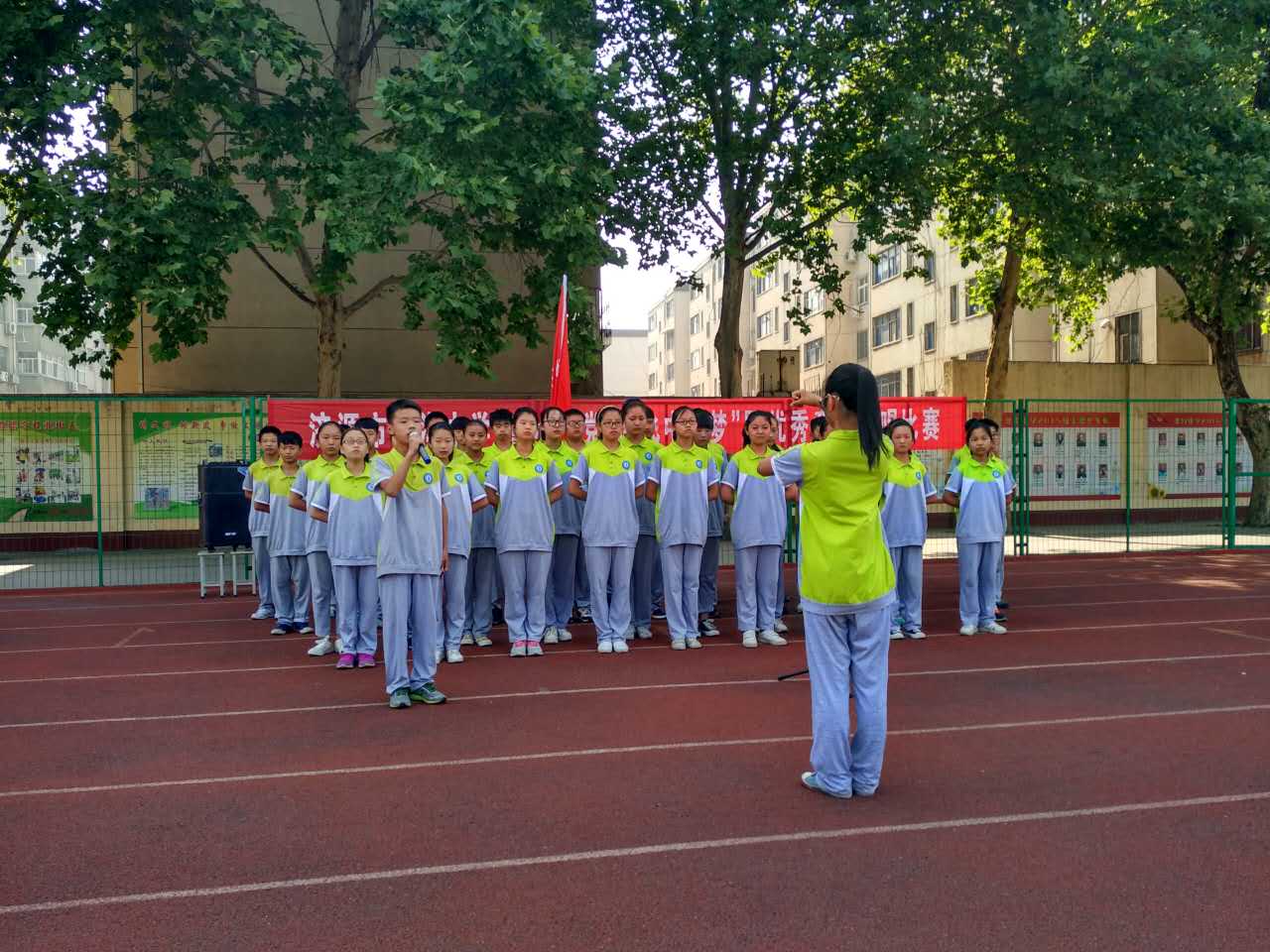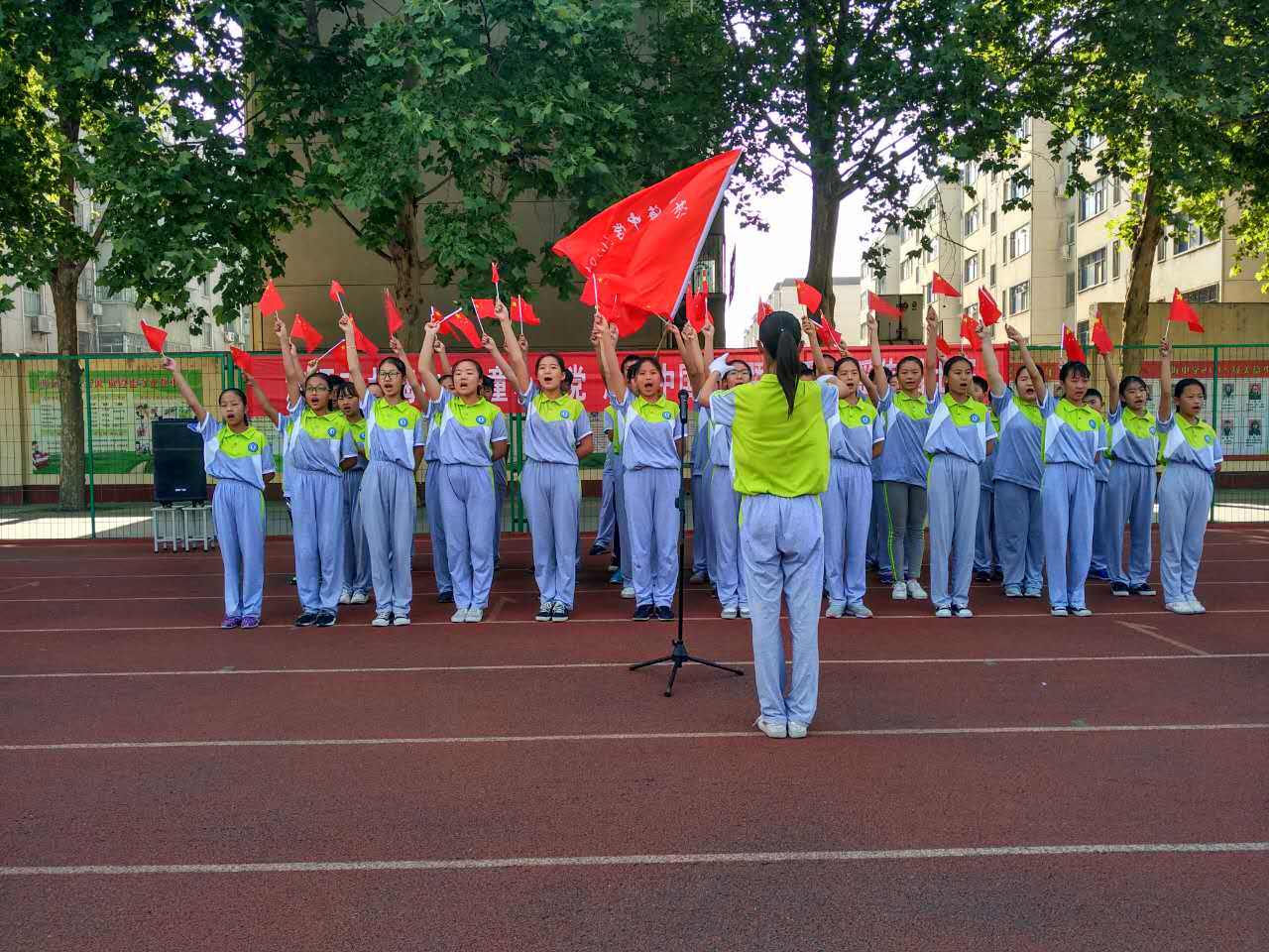 ,党的阳光洒满了整个校园,我们健康、快乐地成长。一面面国旗挥舞着,一张张笑脸绽放在夏日的阳光里,七九班一曲《国家》拉开了“童心向党放飞中国梦”歌咏比赛的序幕。五十六个星座五十六只花五十六族兄弟姐妹是一家七二班深情演绎了《爱我中华》火映红星哟星更亮,血染红旗哟旗更红七一班的《映山红》让我们重温了对红军英雄的无限热爱与不舍之情。七十一班的一曲《十送红军》更是让我们领略了石老师的指挥的魅力,台下师生掌声雷动!七三班的《中国功夫》,铿锵有力,把比赛再一次推向了高潮。七八班的《红歌串烧》,点燃了全场学生的革命激情!七六班带来的《众人划桨开大船》把我们七年师生的心紧紧团结在一起,众志成诚,共创北中辉煌!
